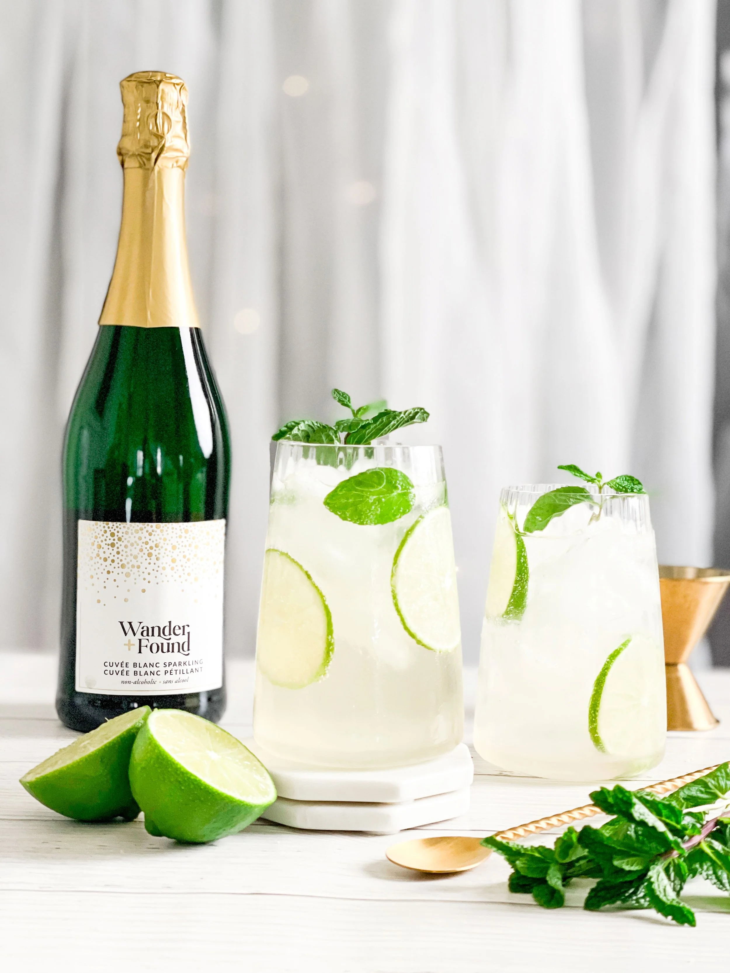 The Wander + Found Sparkling Cuvee Blanc has crisp and tart notes of green apple, lime and fresh minerality, which makes this complex and elegant bubbly a perfect match for the floral and herbal ingredients. You can find Wander + Found online in both Canada and the U.S.