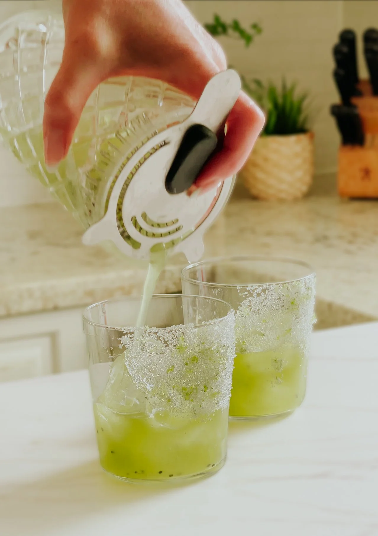 Divide between two bodega glasses with fresh ice, using a hawthorne strainer to prevent the kiwi from blocking the top of a traditional cocktail shaker spout.