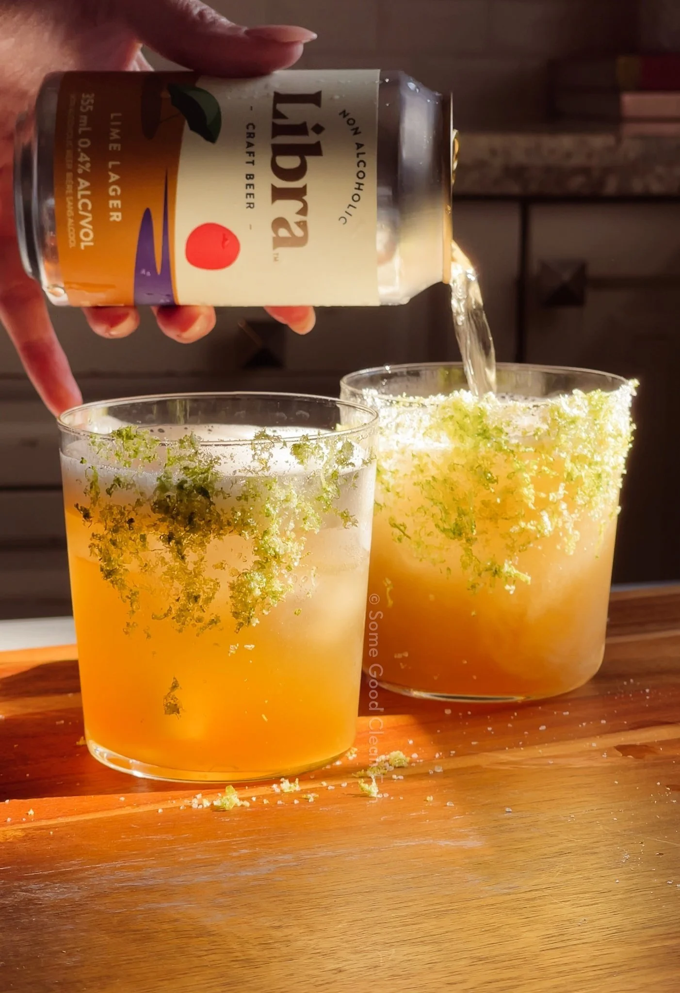 We’re using bodega sized glasses in this recipe so that one can of lime lager can be used across two drinks.