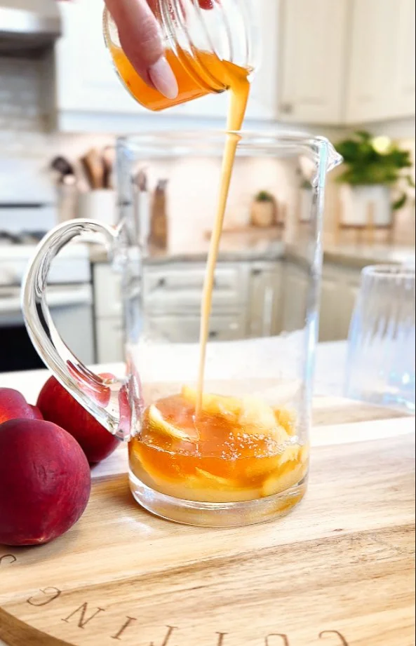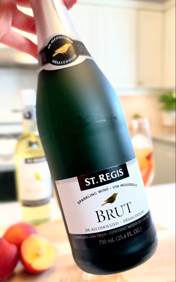 /Peaches and hot honey are trending right now, so it inspired me to make this spicy non-alcoholic white sangria with St. Regis wines. This is a make-ahead batch recipe, so don’t try to make this five minutes before your guests come over! But you CAN find St. Regis wines quickly in your neighbourhood - it’s an accessible and wallet-friendly brand and bonus, Forbes magazine rated their non-alcoholic chardonnay highly. It’s a perfect option for an alcohol-free summer sangria!
