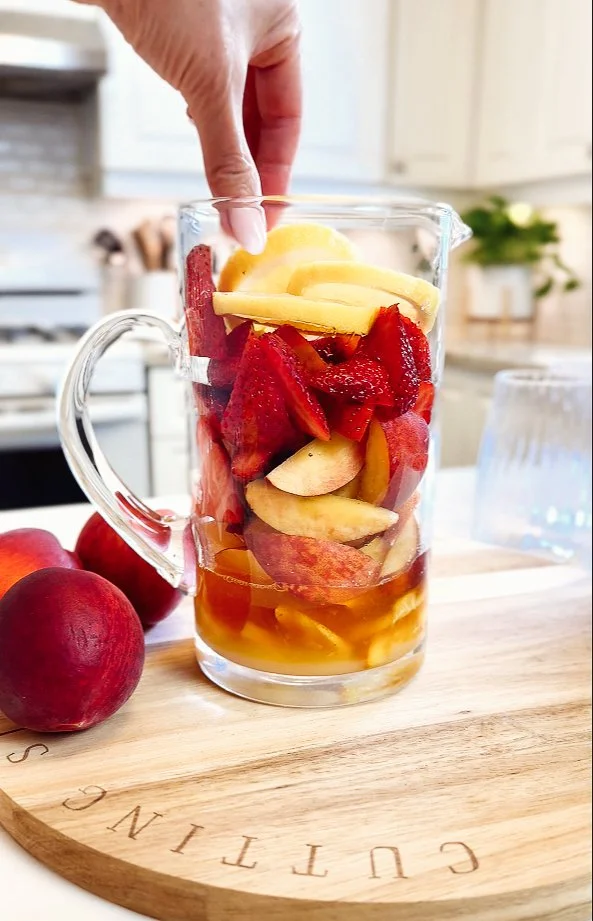 Once the citrus mix is ready, pour in the whole 1 cup batch of spicy peach syrup. Layer in fresh fruit - peach, strawberry, lemon and a tiny bit of orange - don’t over do it with the orange!