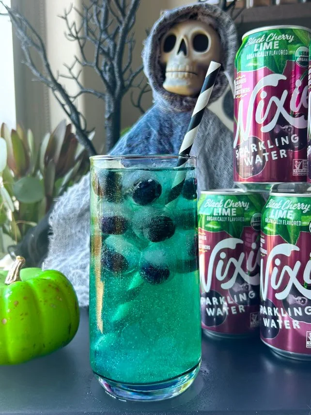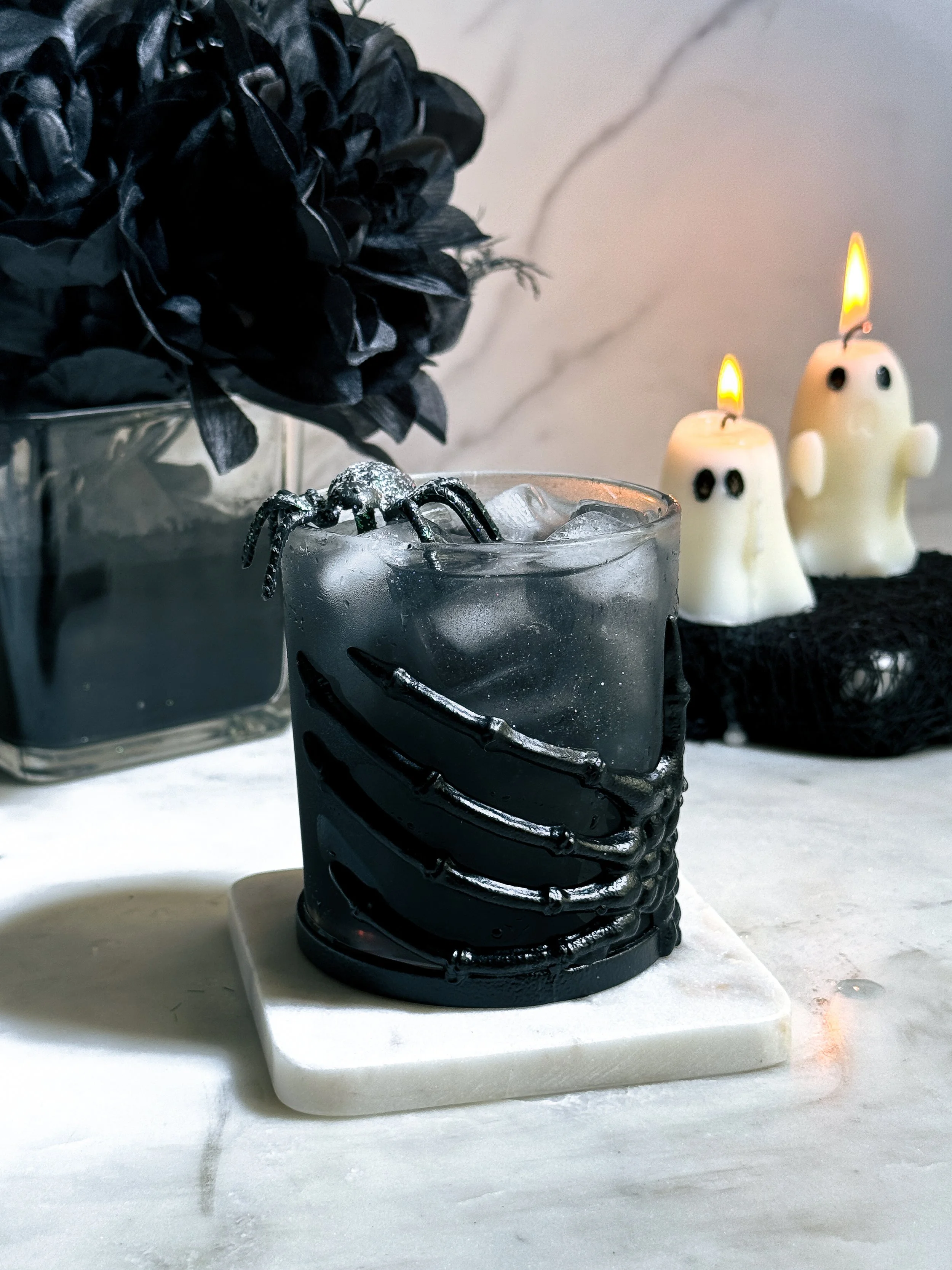When I first started in this niche, I thought you had to use black charcoal powder to make spooky drinks. The mess I made was enormous, and there was always a gritty texture to my mocktails when I used it. It wasn’t until last year that I discovered black cocktail glitter, which turns your drinks into a sparkling witchy black liquid. Be warned though: not all glitter is created equal. Shimmer powder is not the same as edible glitter. One makes it shimmer, the other is actual glitter. Beginner tip: you need A LOT of glitter for each drink if you’re stirring it in, but not quite as much for a shaken drink. Add the glitter to the shaker for better distribution!